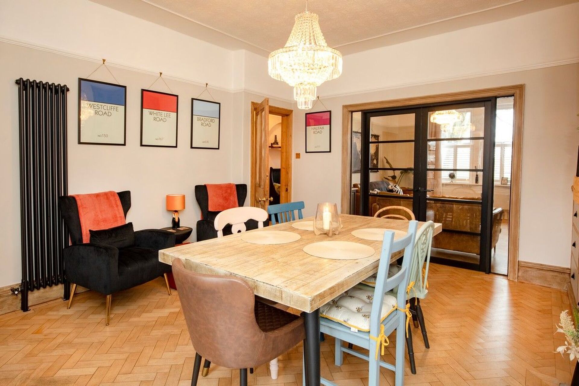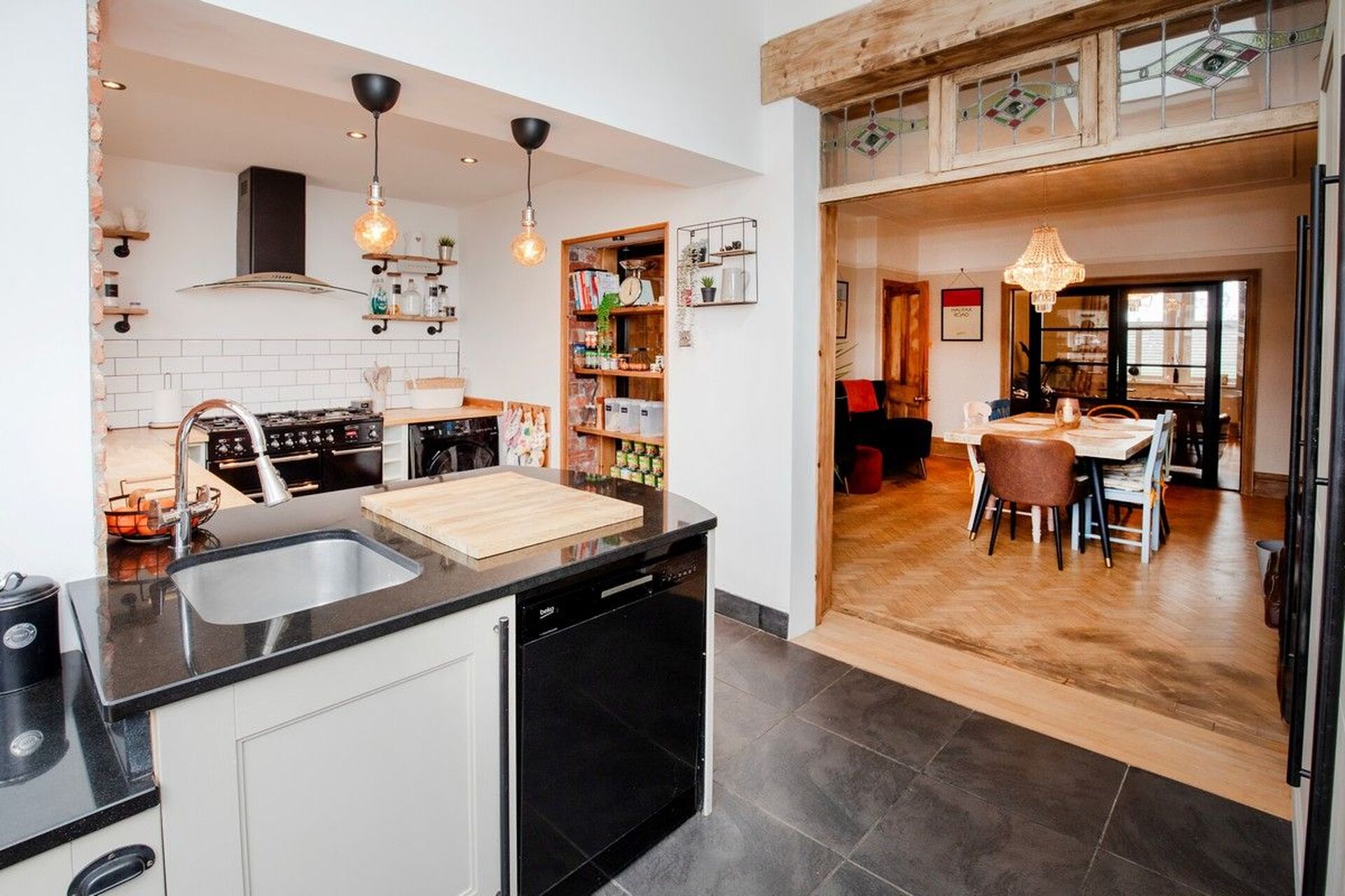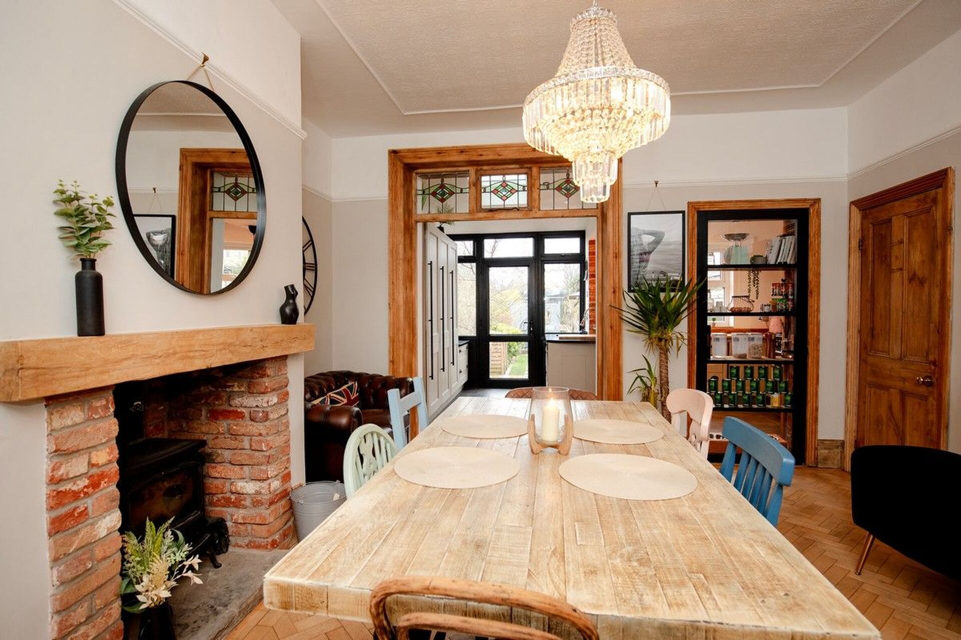 A huge dining area having an original period cabinet to the chimney alcove comprising of drawers and cupboards. A multi-fuel stove is set within the chimney breast with a brick surround and oak mantle. A retained door frame with the original stained-glass windows creates a unique feature whilst providing a divide between dining room and the kitchen.