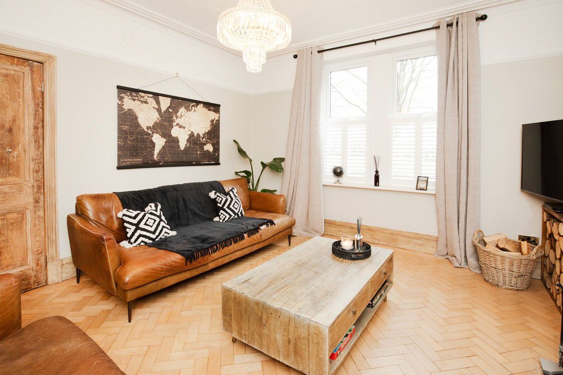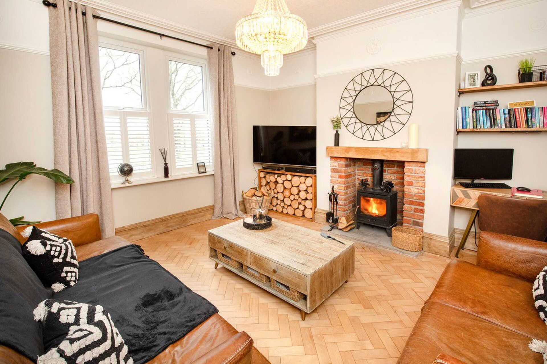 A light and bright front aspect living room, high ceilings with ornate coving and a central rose provides a true feeling of space. There is a multi-fuel stove set into the chimney breast with feature brick surround and an oak mantle. Double glazed front window with shutter blinds.