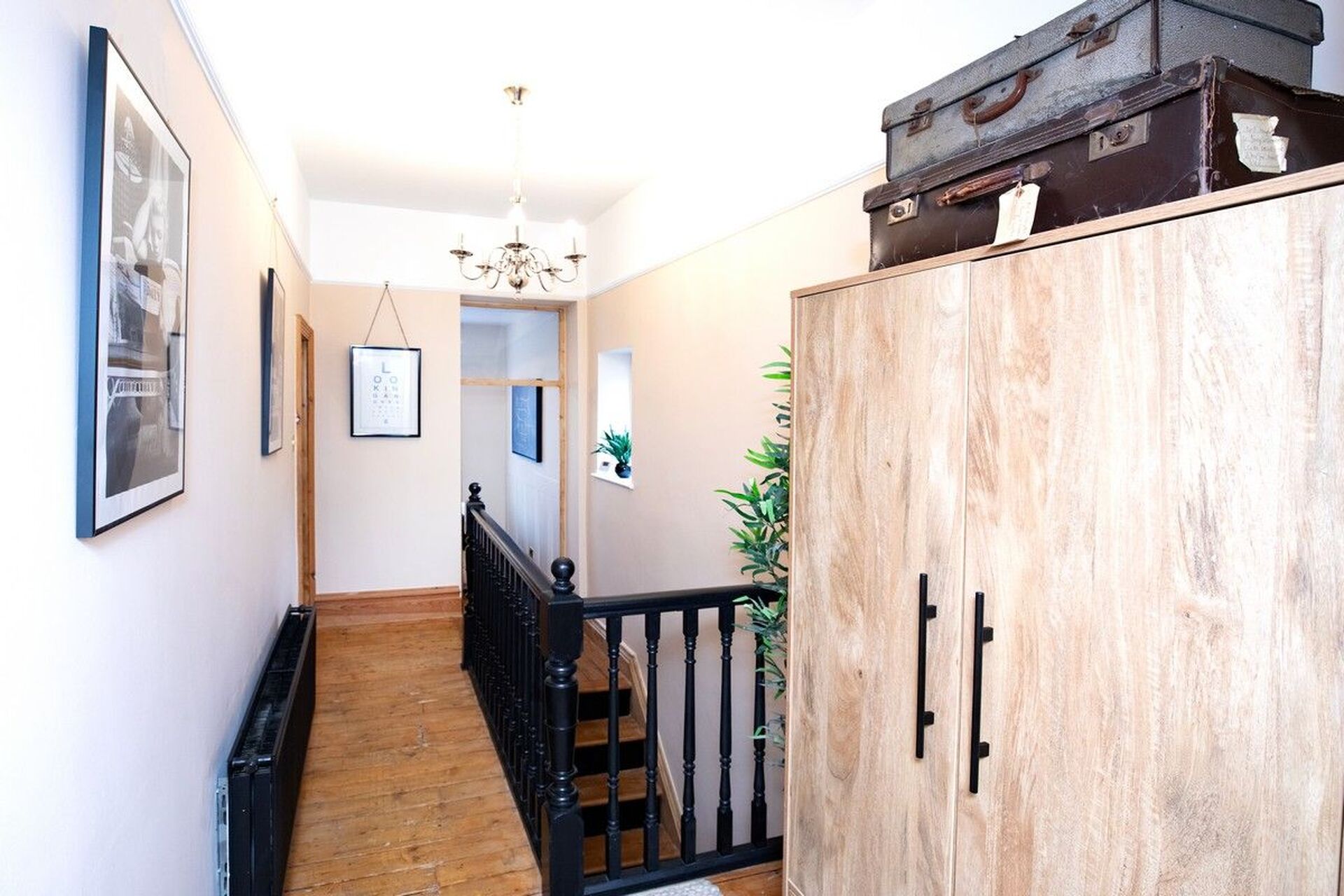 An elegant landing area having stripped pine balustrade banister and radiator. Loft access point via timber drop down ladder. (Loft boarded for storage, housing central heating boiler) Potential subject to local authority consent to convert to a large forth bedroom.