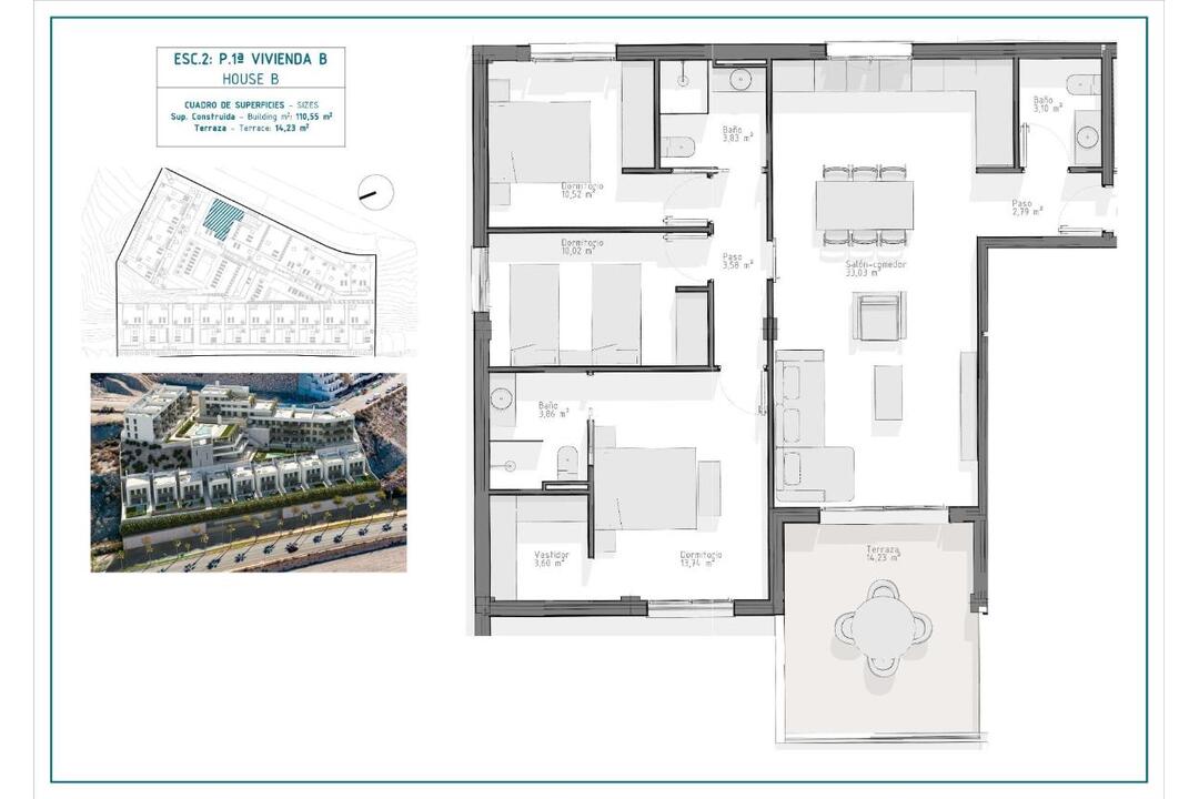 NEW BUILD RESIDENTIAL COMPLEX IN AGUILAS New Build exclusive residential complex of apartments and villas in Aguilas. New Build complex consist of 36 apartments with 3 and 2 bedrooms distributed in 4 modern blocks, equipped with 2 communal swimming pools and community garage with parking space and storage room for each property; and 10 elegant villas of 4 bedrooms and 3 bathrooms, each one with its own private pool. This residential complex has been designed with excellence in mind, offering spacious terraces on the ground and first floors and solariums on the upper floors, where the view of the horizon becomes a canvas of experiences. The houses have fully equipped kitchens and bathrooms and pre-installation for ducted air conditioning. Complex located 800 metres from the sea, next to a Shopping Centre. Aguilas located in exceptional area on Costa Clida at only 50 minutes from the new Murcia or Almeria airport and 1h30 from Alicante airport. Aguilas it is a small city with many amenities, a long beach to walk and relax in the sun. Is a perfect enclave for diving, water sports, hiking and golf. It has 28 kilometers of coastline in which there are 35 beaches with different types of sand thickness located in different landscapes, from coves and virgin beaches in natural settings to the urban beaches of the town of Aguilas. Its warm desert climate is present all year round with an annual average of 22 with mild temperatures in winter and very hot in summer.