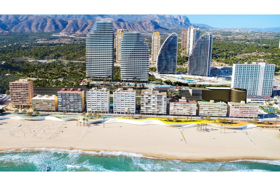 This new development 2nd line, has a unique design with a touch of sophistication that modernises the skyline of the Poniente beach of Benidorm. The properties are built on over 20,000m2 that includes communal and recreational areas totalling more than 10,000m2 and accommodating extensive, well-tended gardens, 3 swimming pools, 3 Jacuzzis, a chill-out lounge area with 2 bars, one wet and one dry, and sun bathing areas by the pools totalling over 2000m2 with natural grass among other features. The extensive line-up at this residential complex also includes a large sports area to make even the most demanding of athletes happy, equipped with a heated swimming pool, a tennis court, a paddle court, multi-sports court, petanque courts and a 150m2 panoramic gym. The children's playground, the climbing wall and the pool are all within the security perimeter. The large sandy beaches are just 150 metres walk and with bars, restaurants and supermarkets all close by.