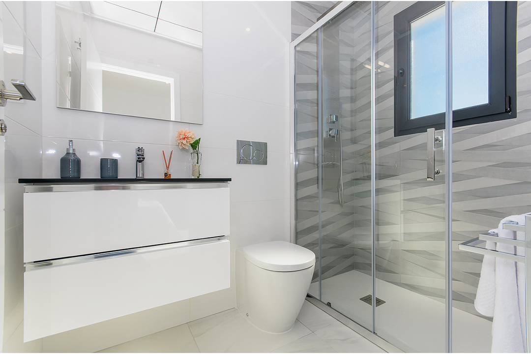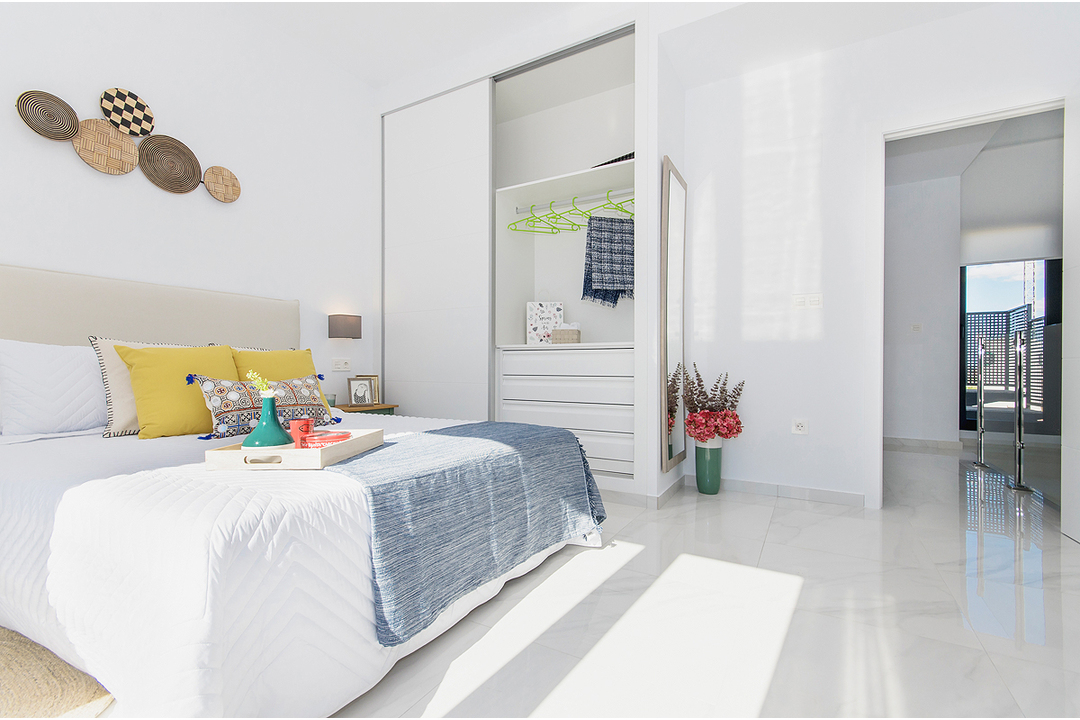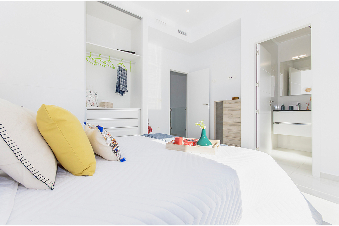 New modern three bed three bath villas located in Vistatbella golf resort with all amenities on hand. The villas come with one double bedroom downstairs and two double bedrooms upstairs both with en-suite bathrooms and terrace. There is an option for a solarium if required. There is a private pool and off street parking.