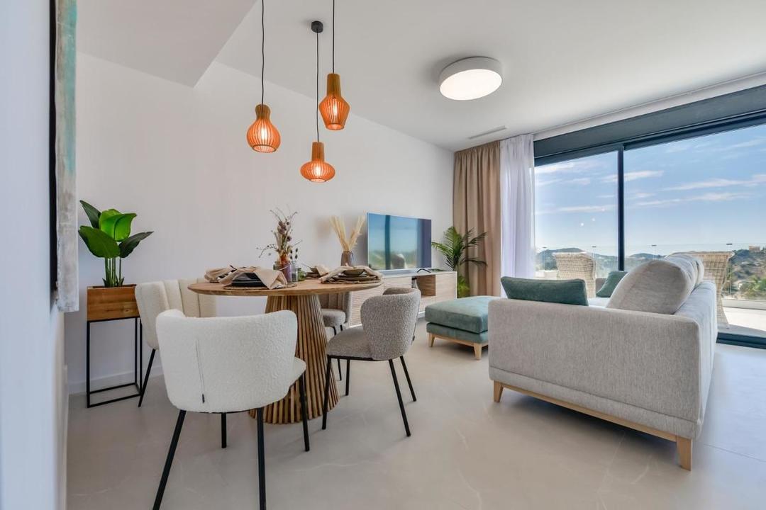 NEW BUILD LUXURY RESIDENTIAL COMPLEX WITH SEA VIEWS IN FINESTRAT New Build Luxury residential complex of bungalow apartments, duplexes and penthouses in Finestrat. Beautiful ground floor apartment has 3 bedrooms 2 bathrooms, open plan kitchen with the lounge area, fitted wardrobes, terrace and private garden. Each property has private parking space and storeroom. A complex with large common areas: -Infinity pool -Paddle courts -Covered heated pool -Gym -Meeting room and shared work -A large pedestrian and bicycle path that runs through all the common spaces. -Large masses of vegetation This development is perfectly located in a natural enclave of the Costa Blanca and offers incredible views of the Benidorm skyline, Finestrat cove and El Puig Campana. Benidorm is just a five-minute drive from the properties and offers all the services you would need including shops, bars, restaurants, supermarkets, banks, pharmacies and several private international schools. Close to the beaches of Levante, Poniente and Cala de Finestrat, with more than 6km in length that are among the best in Europe awarded by the European Union with Blue Flags. All leisure services such as the theme parks of Aqua Natura, Terra Mtica, Terra Natura, Aqualandia and Mundomar, Sierra Cortina and Villaitana Golf courses, hiking and climbing in Puig Campana an incomparable natural setting or enjoy of nautical sports. Distance to the sea 4 km, to the airport 26 km and to the golf 1km. Complex located 40 minutes from Alicante airport.