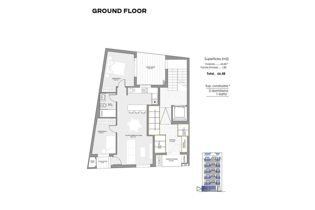 NEW BUILD APARTMENTS IN TORREVIEJA New build exclusive project of apartments and penthouses in Torrevieja. Carefully designed apartment building with community pool and just 100m away from the beach and close to all amenities and services. The apartment building consists of a total of 10 units: - Eight 1 bedroom,1 bathroom apartments with balcony - One ground floor 2 bedrooms, 1 bathroom apartment with patio - One penthouse 2 bedrooms, 1 bathroom apartment with terrace. All apartments benefit from a communal solarium with a pool and chill-out area. The building has an elevator. Torrevieja is a Spanish town in the province of Alicante, on the Costa Blanca. It is known for its typically Mediterranean climate and coastline. It has boardwalks with resorts along its sandy beaches. The small Museum of the Sea and Salt houses exhibitions on the fishing and salt history of the city. In the interior, the Lagunas de La Mata-Torrevieja Natural Park has trails and two salty lagoons, one pink and the other green. Alicante airport located 40 minutes away and Murcia airport about 1 hour away.