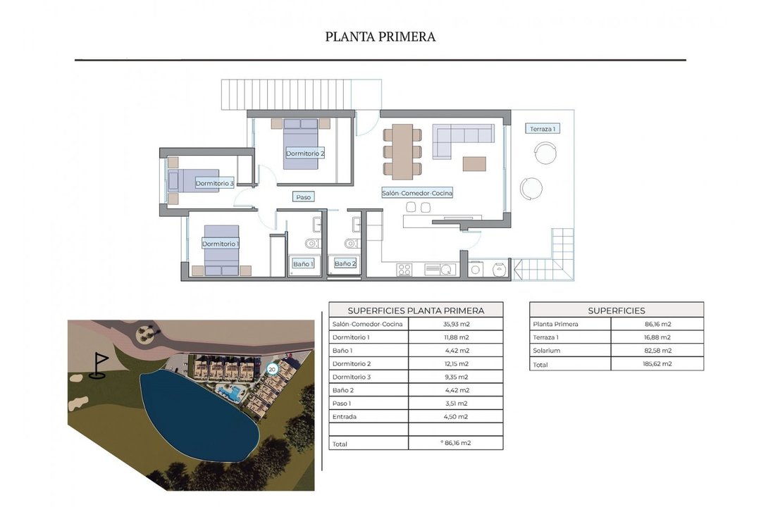 NEW BUILD RESIDENTIAL COMPLEX IN FINESTRAT New Build luxury residential complex of bungalows in Finestrat. Complex located on the new Puig Campana golf course and has spectacular views of the skyline of Benidorm and the Mediterranean sea. This complex, consisting of 32 bungalows with 3 bedrooms and 2 bathrooms, is built with quality materials and maximum attention to detail. Ground floor bungalows with private garden and top floor bungalows with private solarium. The properties have access to a large swimming pool and enjoy one of the best locations on the Costa Blanca. It is a great opportunity and privilege to be able to live with this environment of golf and beach, close to all amenities of all services considered one of the best places to invest. Residential located on the golf course, near theme parks, a large shopping centre and a few minutes from the beaches of Benidorm. Finestrat located in the Marina Baixa region of the Costa Blanca, close to neighbouring Benidorm and about 40 kilometres from the city of Alicante and the international airport. The village is situated on the mountainside of Puig Campana and offers beautiful views of the mountains, the coast and the Mediterranean Sea.