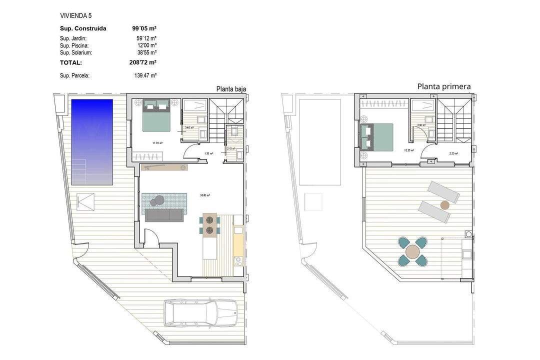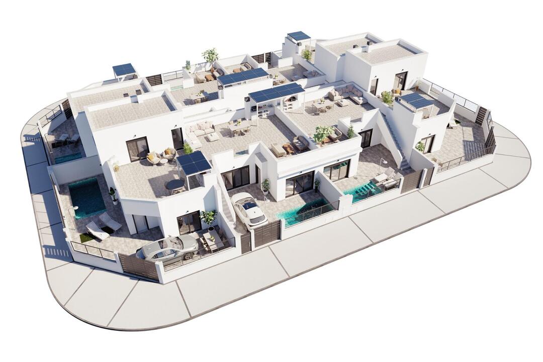 NEW BUILD RESIDENTIAL IN TORRE-PACHECO New build development of 8 townhouses and quads located in Torre-Pacheco Modern properties with 2 bedrooms and 2 bathrooms, open plan kitchen with living room, fitted wardrobes, terrace, private solarium, garden with the pool and parking space. These exclusive homes are designed with elegant and functional interiors, fully equipped kitchens, electrical appliances included. The bathrooms have a vanity unit with washbasin and light. The bedrooms include lined wardrobes with drawer units and each property has pre-installation for ducted air conditioning. The exteriors are no less impressive, including a private swimming pool and a large solarium with summer kitchen so you can enjoy the sun all year round. In addition, the properties have pre-installation for electric car chargers. Located next to Club de Golf, Torre Pacheco, where you will find all amenities including bars, restaurants, supermarkets and banks and a 15min drive to the lovely beaches of the Mar Menor. Torre Pacheco is surrounded by award winning golf courses and the whole region is regarded as one of the healthiest places to be in Spain. This ideal location gives you so much more for your money. Within walking distance to local amenities and many bars and restaurants. Motorway network nearby to enable you to travel to other areas quickly and easily. Murcia international airport is 20 minutes away.