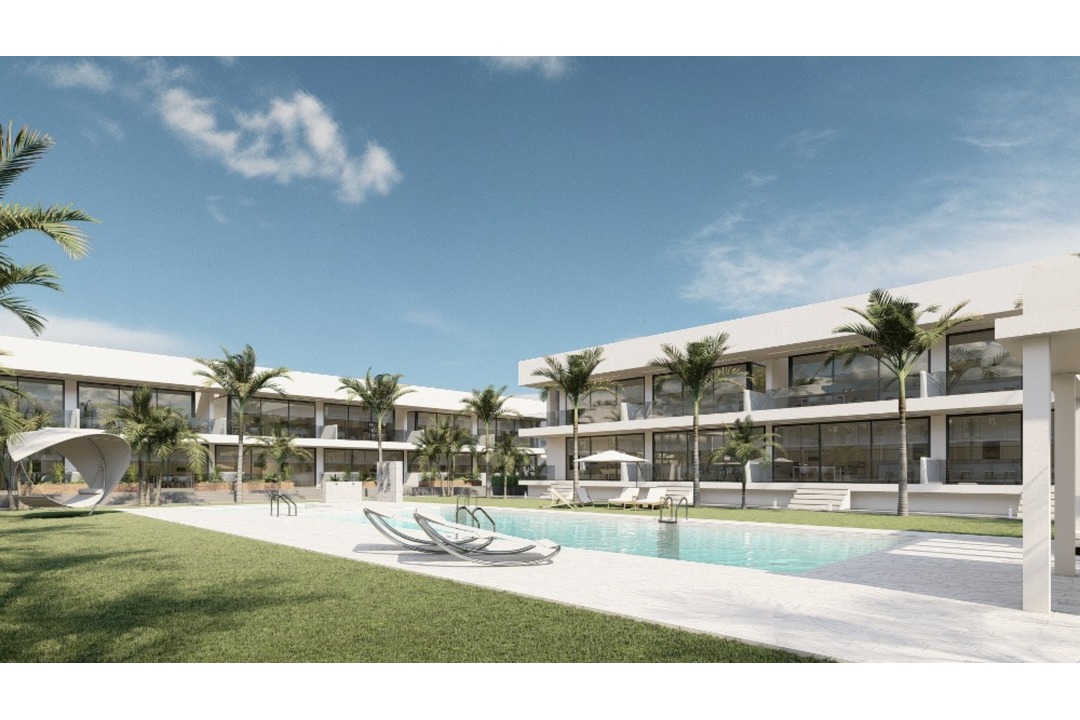 New modern apartments for sale with communal pool very close to the sandy beach in Mar de Cristal. There are two and three bedroom apartments all with two bathrooms. The master en-suite bedroom has a dressing room. The fully fitted kitchen with breakfast bar is open to the spacious living-dining area. There is a separate laundry room. The living area has large windows providing much natural light and access to a large private terrace which in turn provides access the communal pool and garden area. The prime location with just a stroll to the sandy beaches of the Mar Menor as well as a few minutes drive from various golf courses in the area La Manga club is a 5 minutes drive. It is very close to natural sites such as the Regional Park of Calblanque, Cabo de Palos and the fantastic beaches of the Mediterranean Sea. Restaurants, shops and leisure areas are also just a few minutes away.