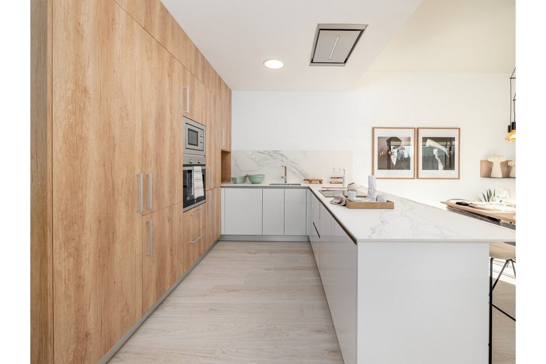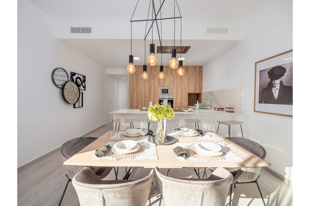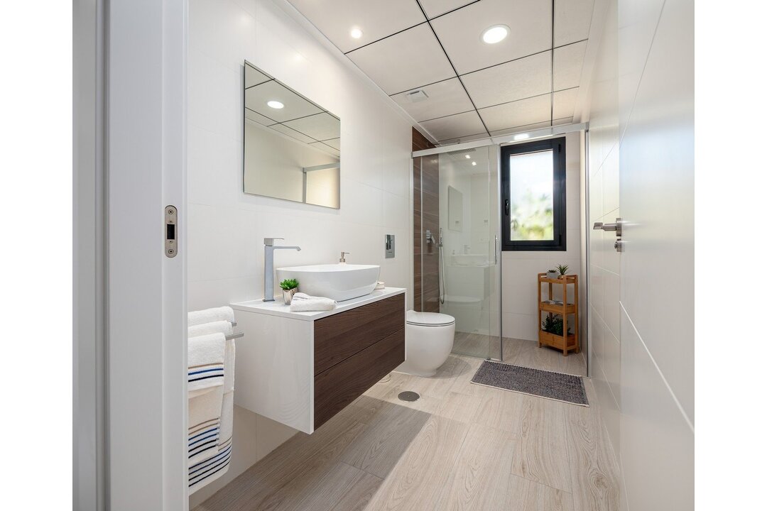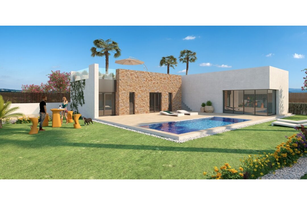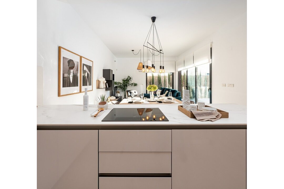 LUXURY VILLA NEXT TO THE GOLF COURSE. Enjoy the tranquility of living in a privileged environment. Its unique location next to La Finca Golf Course With a relaxed and healthy landscape surrounded by nature and with a wide range of sports and leisure services. A few kilometers from the most impressive beaches on the Costa Blanca. These villas connect us with ancient Mediterranean cultures and the tradition of construction combined with modern architecture to create charming houses, the best in space and design trends. On one floor, designed to make the most of the light, with an "L" distribution, which perfectly separates the living and kitchen areas from the rest areas. The houses have 3 bedrooms and 2 bathrooms, on large plots of more than 300 meters, with private pool, parking area and solarium, within the best golf environment. All the villas are delivered with aerothermal, pre-installation of ducted air conditioning, home automation, aluminum windows with electric shutters, kitchen furniture, alarm, bathrooms equipped with furniture, screen and underfloor heating, or automatic irrigation in the garden, among others.