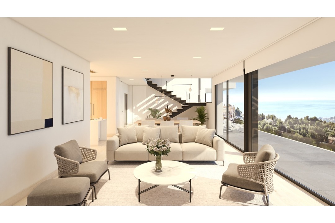 Located on Sierra de Altea this new modern villa has impressive coastal and mountain views and finished to very high standards with many extras and amazing architecture. A villa that encompasses design, efficiency and quality. It has a layout designed to make the most of the capacity of the land and enhance the sea views from its rooms. The entrance is on the top floor, where you can find the hall, which connects with the garage, with space for two vehicles. We can use either the stairs of the lift to go down to the middle floor, where the main bedroom and two other bedrooms are. The main bedroom has an en-suite bathroom, walk in closet and access to a private terrace. The other two bedrooms also each have an en-suite bathroom, spacious wardrobes and they share a terrace between them. On the ground floor is where all the day areas are located, an open and bright space. The kitchen, with a centre island, joins up with one of the porches and exterior terrace, where the endless swimming pool will take us to the sea without leaving the house. The spacious living/dining room, which has large windows, and access to a second porch and the main terrace, is one of the gems of this villa. On this floor, we also find the laundry room, an inside and an outside guest bathroom, as well as the access to the lift, which connects us to the rest of the house. The exterior areas of this property are of major importance due to the wonderful views and the Mediterranean climate, which invites us to live outside. Several terraces, porches and garden areas complete the design of this sensational villa in Altea.