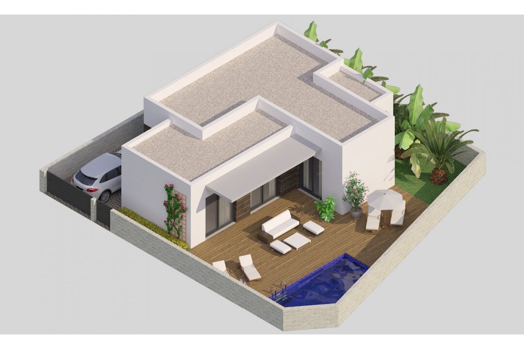 NEW BUILD MODERN VILLAS IN BENIJOFAR New Build villas located in Benijfar, a privileged area of the Costa Blanca, equipped with all services, 20 minutes from Alicante Airport, near the beautiful beaches of Guardamar and several golf courses. It is a modern style villas consisting of spacious living-dining room with an open-plan kitchen, 2 bedrooms( one of them en-suite) and 2 bathrooms. It also has a private plot with terrace, parking area, private pool, Mediterranean-style garden with great views. The house also has hot and cold air conditioning, video intercom and security door. Benijofar it is a lovely village with a charming church and all services such as supermarkets, pharmacies, banks, restaurants and natural park located very close to the villas. There are several golf courses close by as well as water parks in nearby Rojales and Torrevieja. Benijfar located a few minutes from the N-332 and AP-7. Just 30 minutes from Alicante airport, 10 minutes from the beaches of Guardamar and Torrevieja.