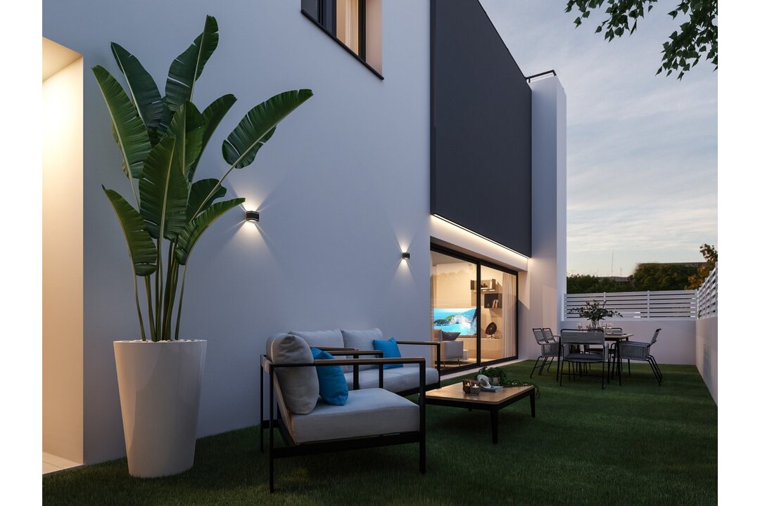 MODERN TOWNHOUSE WITH GARDEN AND SOLARIUM Private urbanization of townhouses, with an area of 100 m2 with private garden and parking. They have 2 floors, on the ground floor there is a large living room with a fully equipped open kitchen, a bathroom, exit to the terrace and parking for 2 cars. On the upper floor are the 3 bedrooms with 2 more bathrooms, one of them en suite and another terrace that is accessed from the main room. There is also access to a private solarium with great unobstructed views. The residential has common green areas, playgrounds and a community pool. 1.5 km from the center of Denia and the beach, in a quiet residential environment where many residents live all year round.