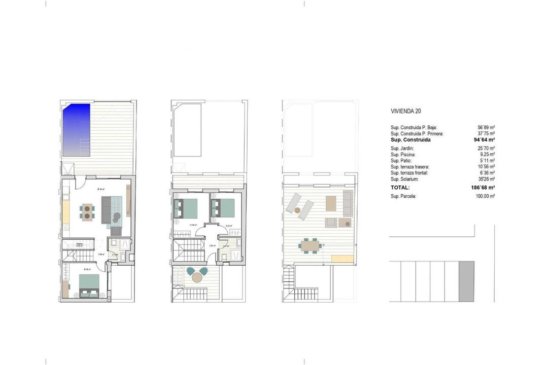 NEW BUILD SEMI-DETACHED VILLA IN DOLORES DE PACHECO New Build townhouses and semi-detached villa located in Dolores de Pacheco, Murcia. Each property has 3 bedrooms, 2 bathrooms, an open plan kitchen with living/dining area, front and rear terraces, solarium with Summer kitchen and private garden with the pool and parking space. Development situated next to a park in the traditional village of Dolores de Pacheco, just 2 km from Roda Golf and Beach Resort and 4 km from Los Alczares, surrounded by services, parks, sports facilities, near several Golf Courses such as Roda Golf and La Serena Golf, plus being 5 minutes far from beach. The property will meet the highest standards and will be equipped with perfect for a holiday home or all year round living in the sun.
