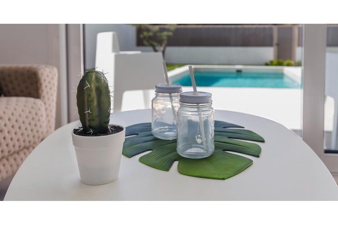 NEW BUILD VILLAS IN SAN JAVIER New Build project of detached villas in San Javier. New Build villas are distributed over two floors plus the spacious roof terrace with beautiful views of the surroundings. On the ground floor there is a bright living room with open plan kitchen and access to the terrace, a double bedroom with fitted wardrobe and a bathroom. On the first floor there are 2 spacious bedrooms, one with built-in wardrobe and the other one with dressing room and bathroom en suite. Private garden with the pool and parking space. San Javier is close to all amenities with easy access to the beach, water sports, shops and the transport network. Here you can enjoy all of the facilities that San Javier has to offer such as the local shops, bars and restaurants as well as being near to shopping centres, the airport of Murcia and all of the beautiful places to be found along the Mar Menor. Corvera/Murcia airport is 30 minutes away and Alicante airport is 45 minutes away.